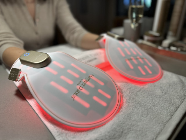 A scrub and soak follows, with a soothing hand and arm massage to buff away dead skin cells, revealing plump, smoothed skin. Whizzy LED hand mitts were then fitted. These space-age mitts use green and red light therapy to target myriad concerns from scarring to age spots. All the while, I enjoyed sparkling wine from the local vineyard, Ridgeview. The treatment culminates with an application of your chosen OPI gel polish — I chose a sugared pink hue. After 80 minutes, I emerged with glossy nails and ultra-soft hands.