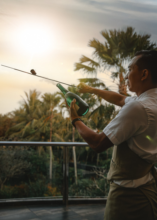 Dining at The St. Regis Bali was a celebration in itself. Each morning began at Boneka, where we eagerly awaited their signature lobster omelette — a dish served in its own cast-iron pan, swimming in a delicate broth, and one we found ourselves craving daily. By evening, The St. Regis Bar came alive with the brand’s famed Champagne Sabering Ritual, a global tradition that here in Bali felt particularly enchanting.